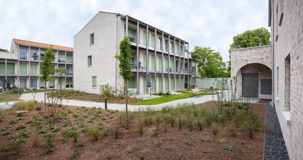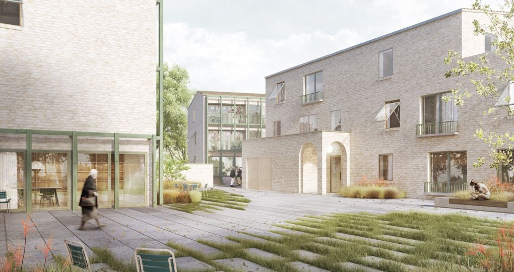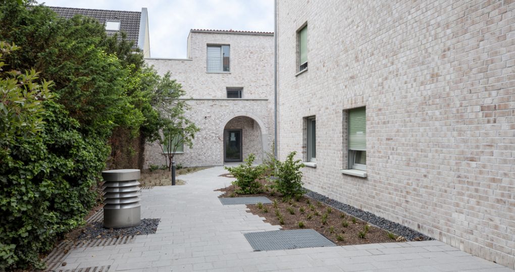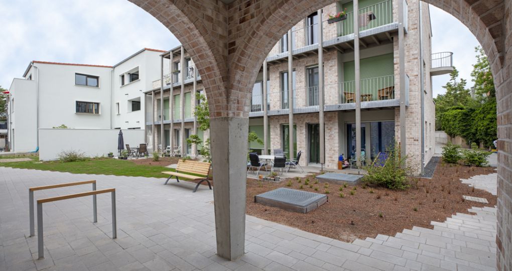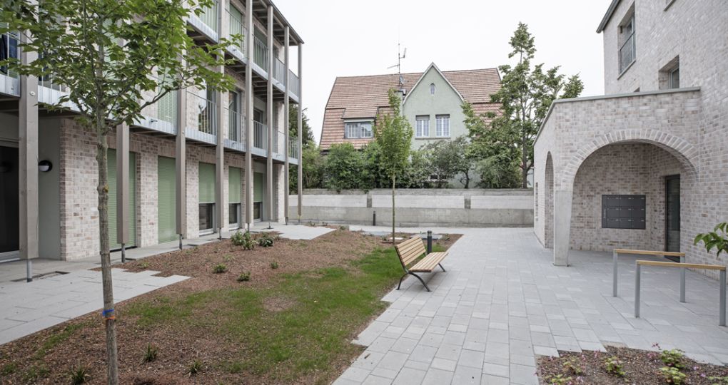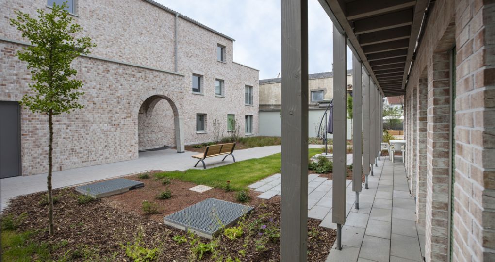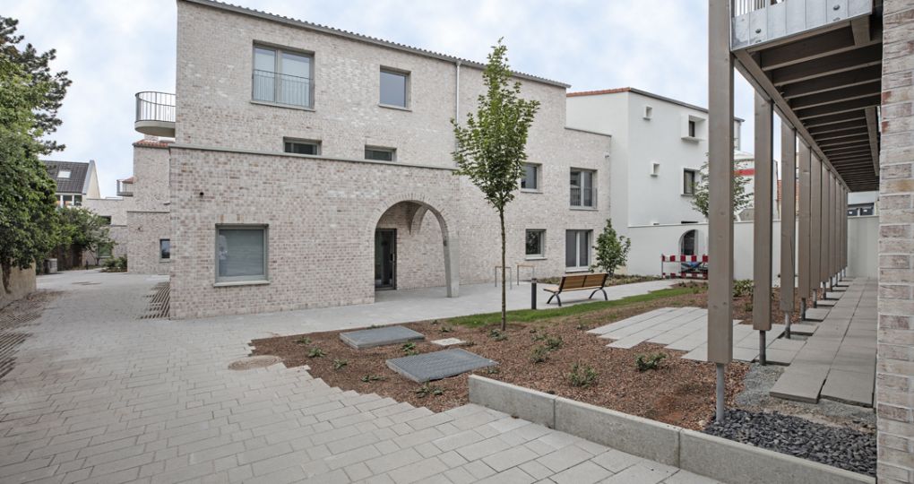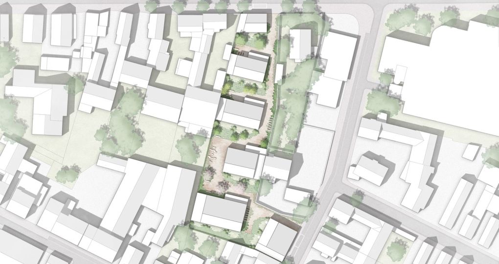 Durch das Aufnehmen der sich aus dem Bestand ergebenden Gebäudeanordnung ergibt sich im Inneren ein abwechslungsreicher Freiraum, der zum einen ein öffentliches Durchqueren zulässt, jedoch zum anderen eindeutig den Charakter eines halböffentlichen Raums vermittelt.