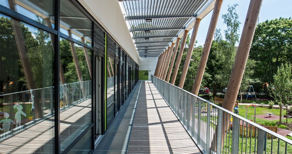 Der fast 50 Jahre alte marode Vorgängerbau auf dem ehemaligen Kasernenstandort war nach einer Untersuchung des Hochbauamtes nicht mehr sanierbar. Hier findet nun ein fünfzügiger Kindergarten mit Kinderkrippe und Horteinrichtung auf zwei Geschossen Platz. Besonderheit ist das nach Süden weit auskragende Dach mit den tragenden Lerchenrundstützen. Es beschattet die Gruppenräume optimal und sorgt für geschützte Spielbereiche auf dem großen Fluchtbalkon. Die Kindertagesstätte in Plus-Energie-Bauweise ist ein Pilotprojekt der Stadt- Frankfurt.
