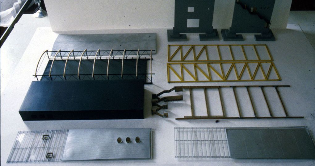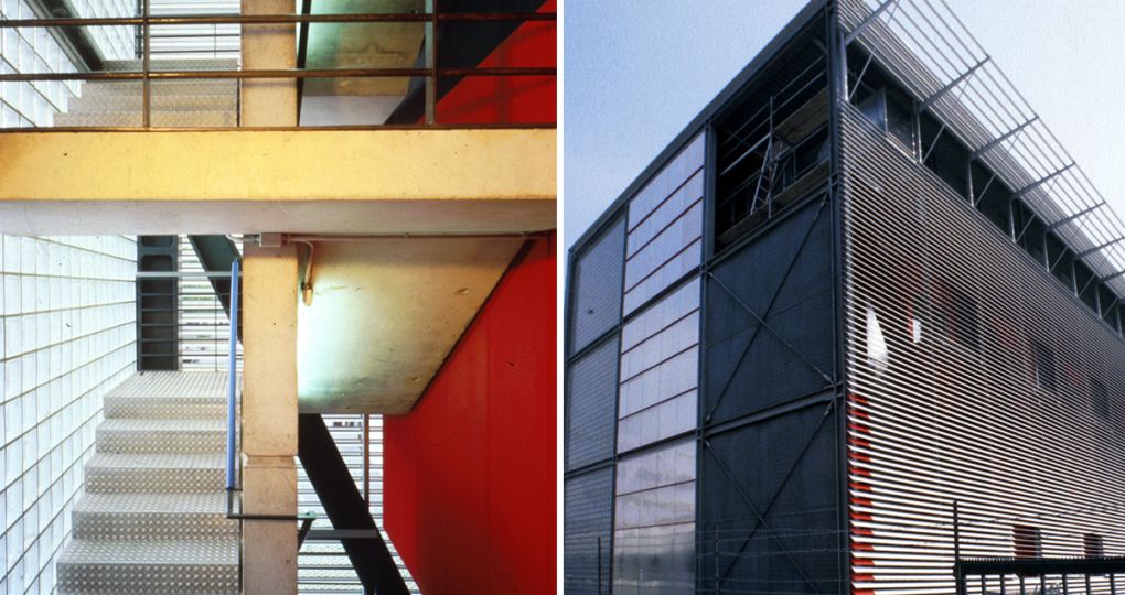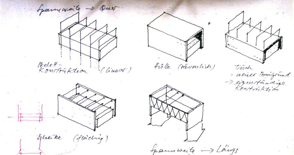 Aufgabe war es für diese Gebäude eine standardisierte Aufstockungsmöglichkeit zu schaffen, die auch bei den engsten innerstädtischen Liegenschaften realisiert werden kann.Der gemeinsame Entwurf sieht einen grossen Brückenträger in der Längsausrichtung des Baukörpers vor. Hierdurch können umfangreiche Fundamentierungen entlang der Längswand vermieden werden. Dieser über 50 Meter spannende, 2 geschossige Brückenträger trägt nun die beiden aufgestockten Geschosse so dass ein Raumgewinn von 200 % verwirklicht werden konnte. Um den Stahlträger vor Witterungseinflüssen zu schützen wurde die gesamte Konstruktion mit einer Alu- Sonnenschutzfassade versehen. Diese "Schichtung der einzelnen Fassadenteile (Alt- Tragend- Schutz) wird durch die Farbgebung intensiviert. Im 2. Obergeschoss klappen die starren Sonnenschutzelemente nach oben und Bilden für die dort befindlichen Büroräume den horizontalen Sonnenschutz. Das Gebäude erhielt 1996 den Deutschen Stahlbaupreis.