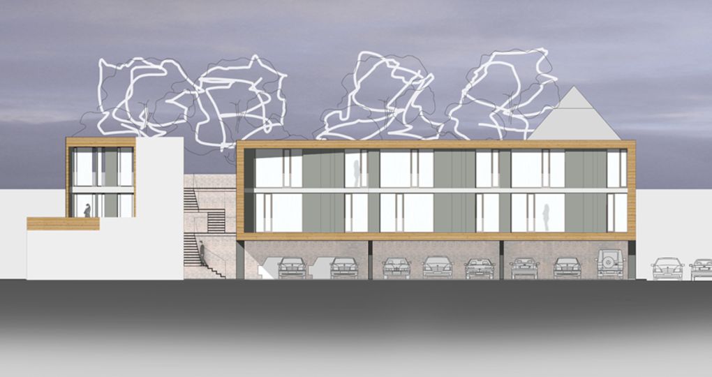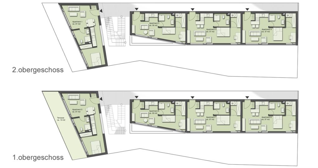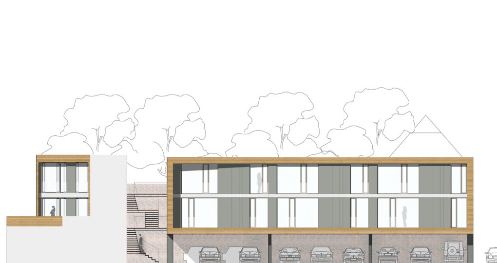 Ende 2014 erhielten wir von einer bekannten Frankfurter Apfelweinwirtschaft den Auftrag auf dem unmittelbar angrenzenden Nachbargrundstück ein Gebäude mit Appartements zu entwerfen. Wir wollten mit unserem Entwurf nicht der alten gewachsenen dörflichen Struktur anbiedern und haben ein modernes, sich nach Süden öffnendes Appartmentgebäude entworfen, das versteckt und doch spürbar, alte Stilmittel der Dorfstruktur aufnimmt. So ist z.B. der Baukörper von der Brandwand der Kelterei der Apfelweinwirtschaft um ca. 1,20 Meter abgerückt. Diese ermöglichte hier die Laubengangerschliessung anzuordnen. Der sich nach Süden öffnende Rahmen erhält eine Holzleistenverschalung um die Kleinteiligkeit der Umgebung aufzunehmen. Das Gebäude wurde um ein Luftgeschoss aufgeständert um die erforderlichen Stellplätze nachzuweisen.