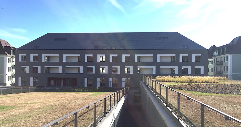 Besonderheit wird die Schrägdachkonstruktion mit Foliendach und Verkleidung mit Faserzementtafeln um den monolithischen Charakter von Fassade und Dach herzustellen.