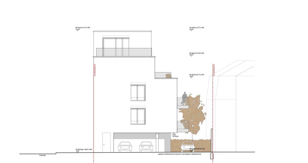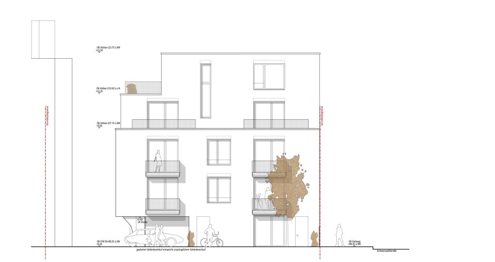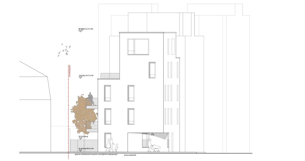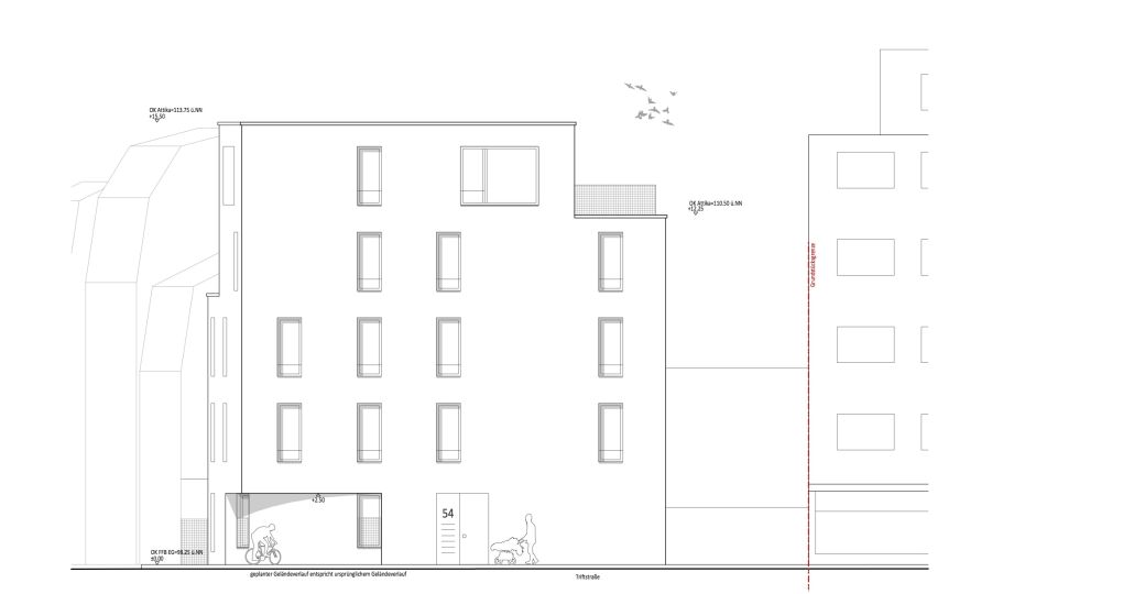 Der Entwurf des Büro Stein Hemmes Wirtz sieht den Abriss des bestehenden Wohnhauses und den Neubau eines 5 geschossigen Mehrfamilienhauses mit 7 Wohneinheiten vor.
